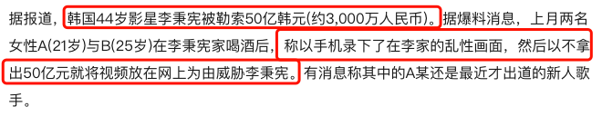没错,他出轨了两位女明星,当然对方也并不是什么善茬,还录下了李秉宪很多带有挑逗意味的话语,并借此向他勒索50亿韩元。
