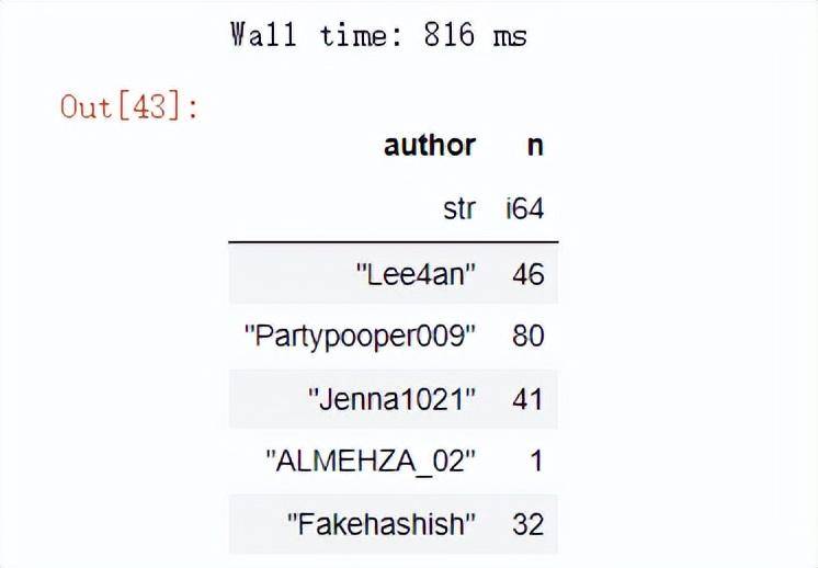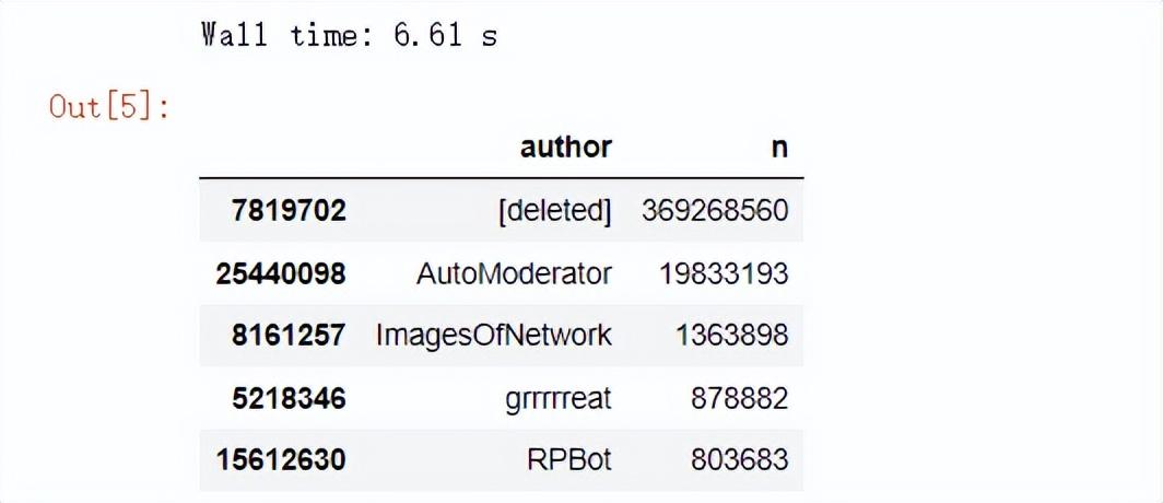 可以看到用polars模块来读取数据仅仅只花费了730毫秒的时间,可以说是快了不少的,我们根据“n”这一列来对数据集进行排序,代码如下