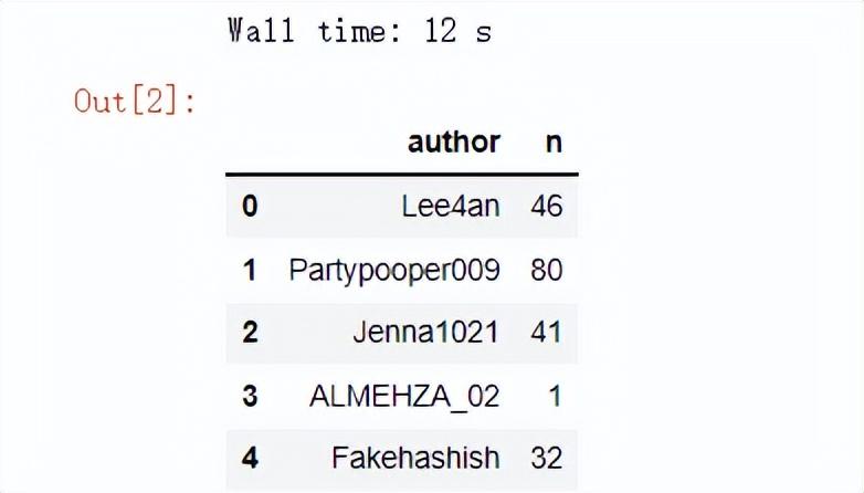 可以看到用Pandas读取CSV文件总共花费了12秒的时间,数据集总共有两列,一列是用户名称,以及用户名称重复的次数“n”,我们来对数据集进行排序,调用的是sort_values()方法,代码如下