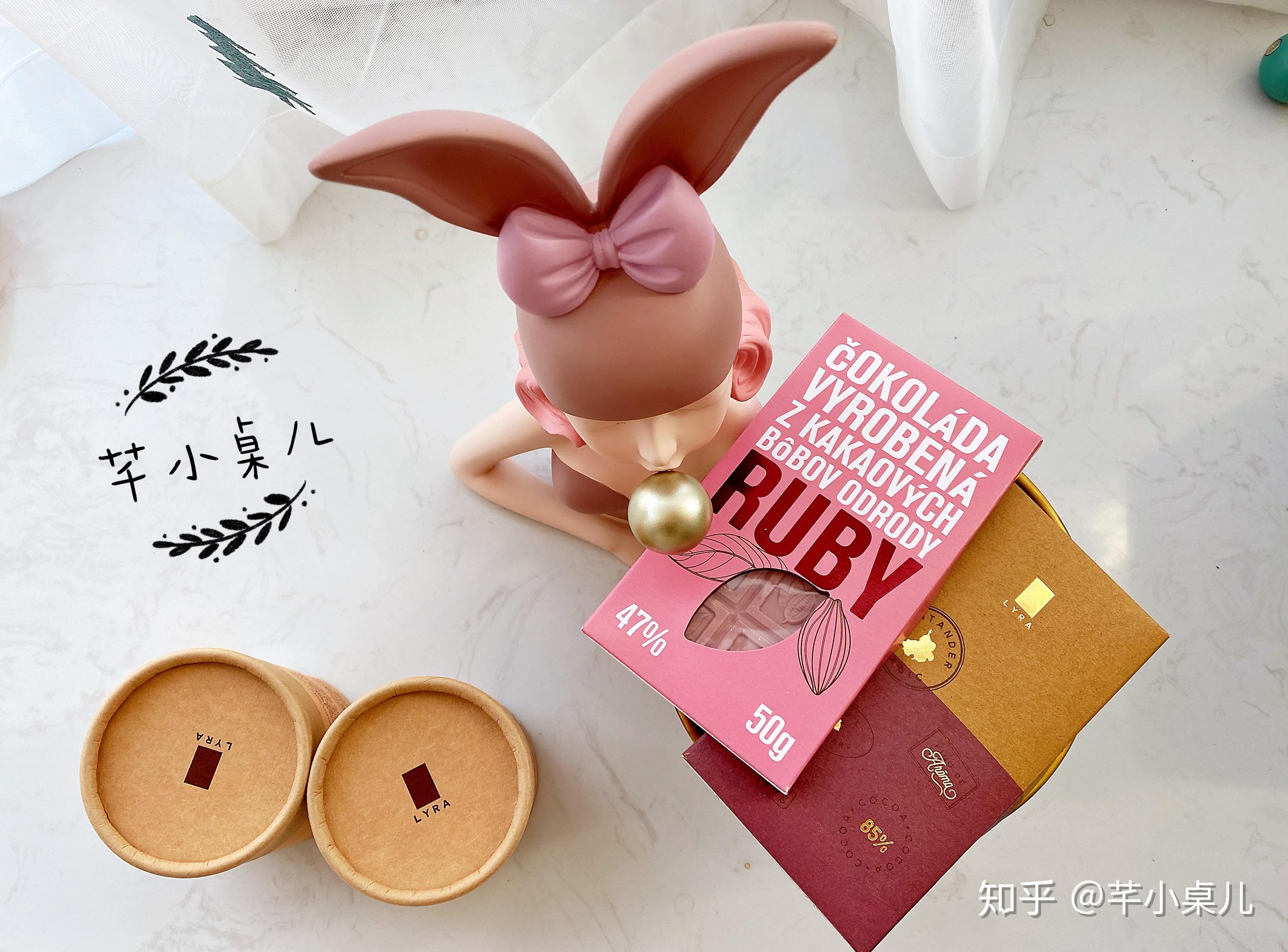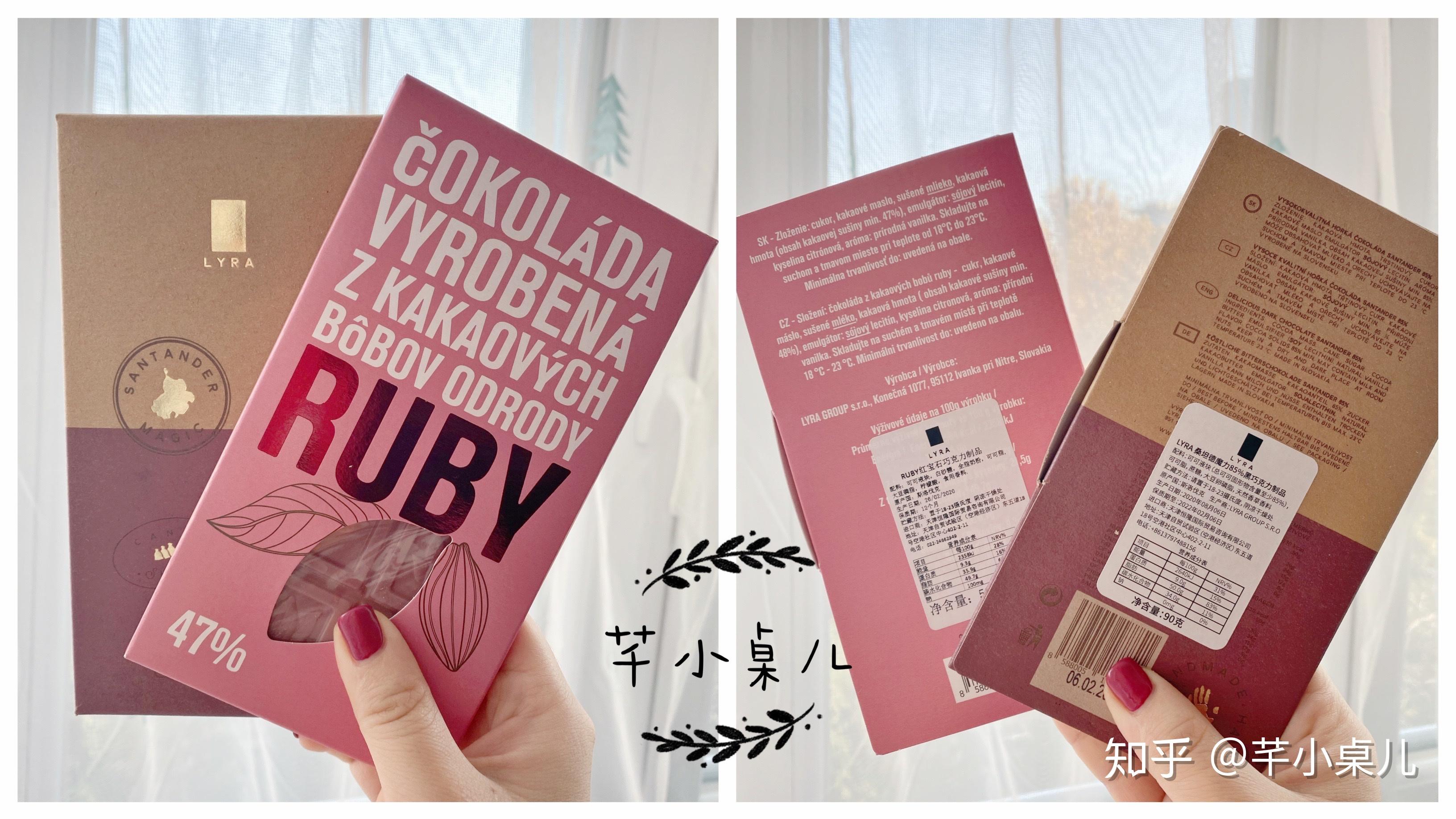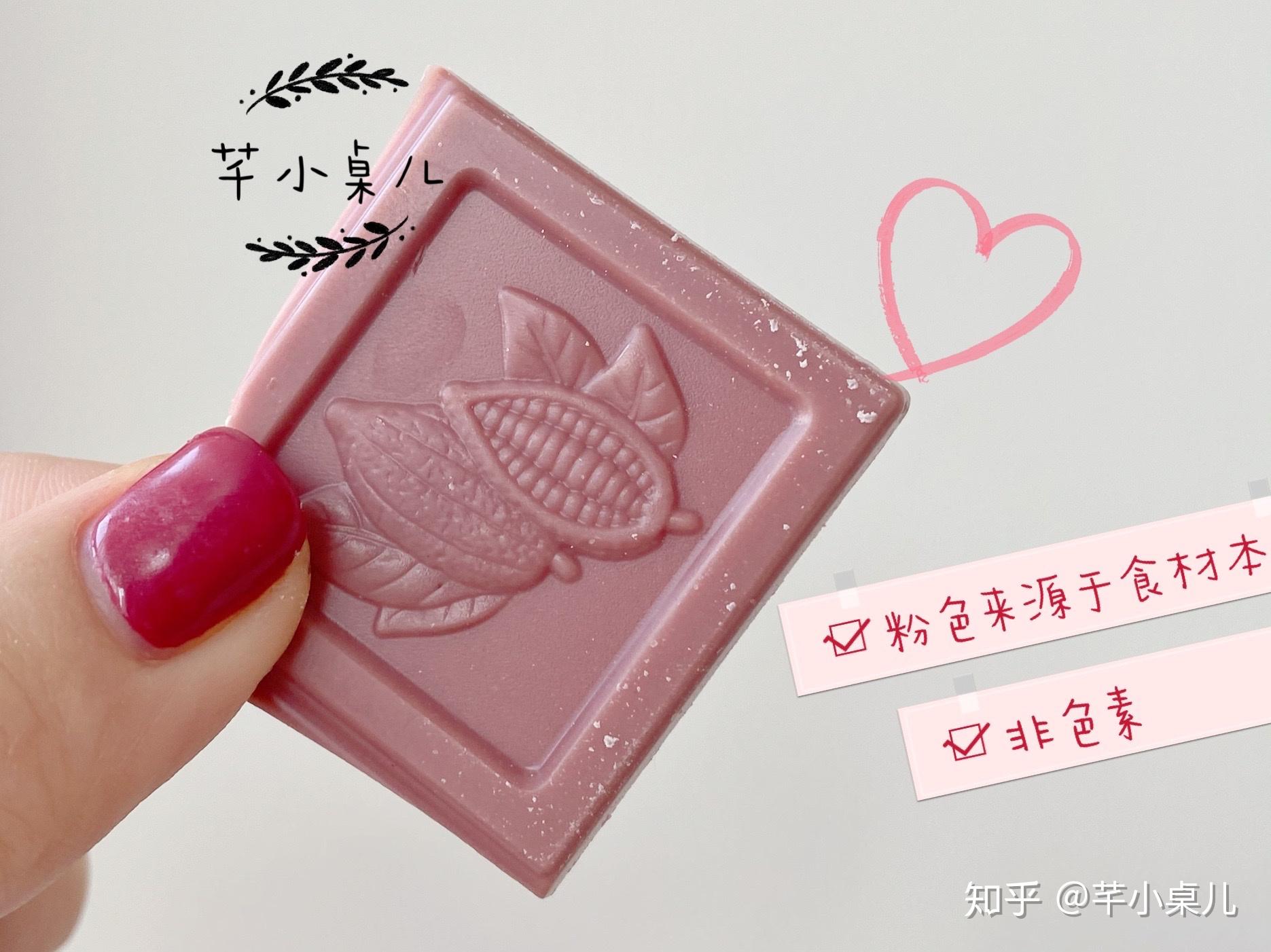 粉红的颜色,来自于特殊的可可品种Ruby [1] 。 非色素添加 。是可可豆在发酵时会渗出红宝石一样的颜色,这种颜色最后也保留在巧克力中,让巧克力呈现出自然温柔的粉红色。