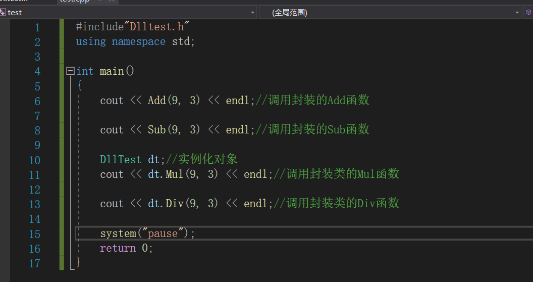 5>>创建一个.cpp源文件开始进行我们动态库的调用,包含头文件后直接可以调用我们封装的函数