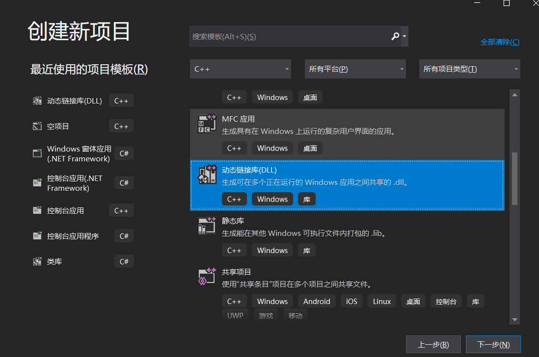 1>>打开Visual Studio选择创建新项选择动态链接库(DLL),点击下一步