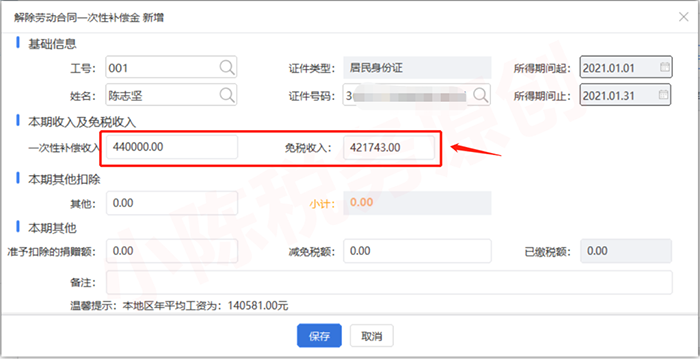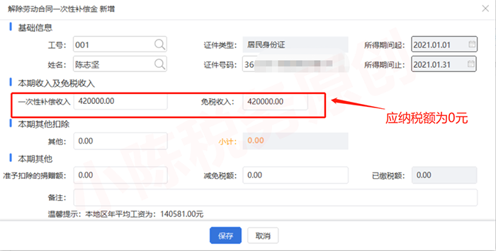 一次性补偿收入在原任职受雇单位所在直辖市上一年度城镇职工社会平均工资3倍数额以内的部分,免征个人所得税,免税收入填写上一年度城镇职工社会平均工资3倍数额。