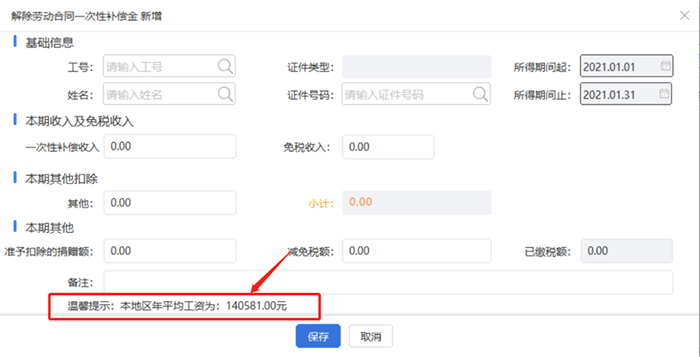 按照系统显示所在北京市(不是海淀区)上一年度城镇职工社会平均工资为140,581.00元,免税收入421,743.00元。申报系统中会显示上一年度城镇职工社会平均工资,如下图:
