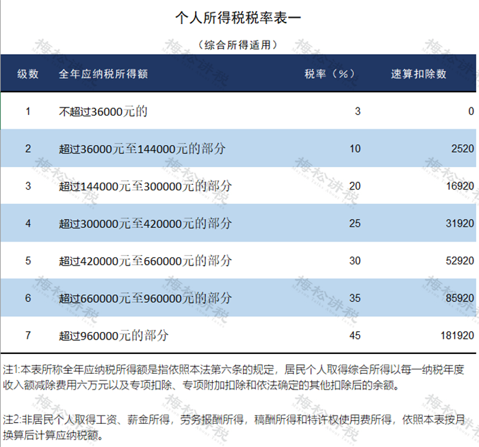 按照综合所得税率表:税率10%,速算扣除数2520;