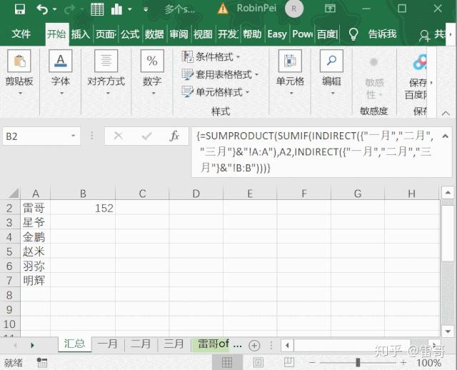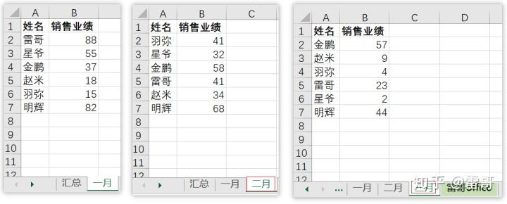 每个工作表中数据的顺序不一致,如工作表“一月”中, 雷哥 数据在第二行;工作表“二月”中, 雷哥 数据在第五行.......