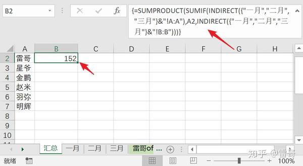 =SUMPRODUCT(SUMIF(INDIRECT({"一月","二月","三月"}&"!A:A"),A2,INDIRECT({"一月","二月","三月"}&"!B:B")))