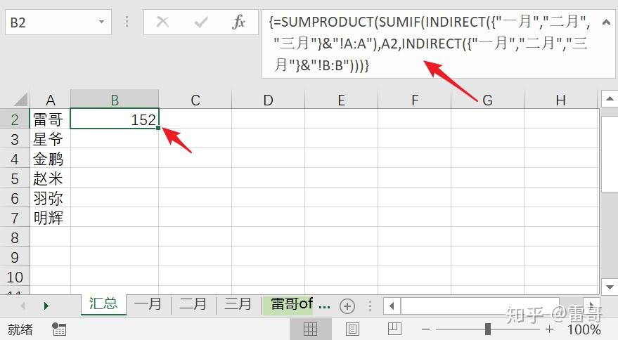 表示分别在表"一月","二月","三月"中查找“雷哥”的销售业绩数据,并对数据进行求和。