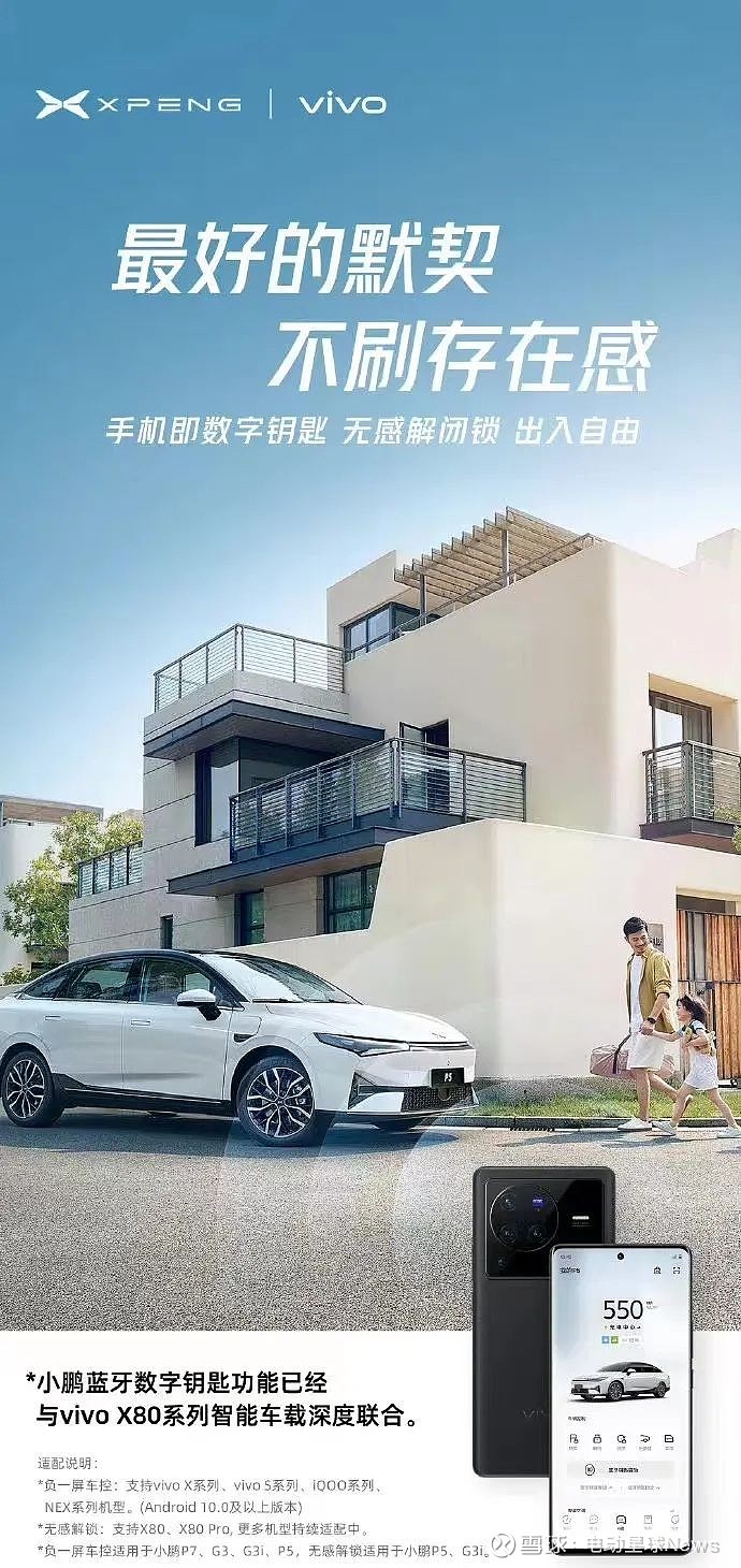 4 月 26 日, 小鹏汽车 宣布,小鹏蓝牙数字钥匙功能已经与 vivo X80 系列智能车载深度联合,支持负一屏车控、无感解锁等功能。