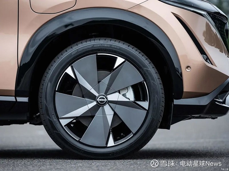 日产 Ariya 搭载雷诺-日产-三菱联盟全新电动汽车平台 CMF-EV,长宽高4595/1850/1665mm,轴距 2775mm,配备 20英寸低风阻轮毂。