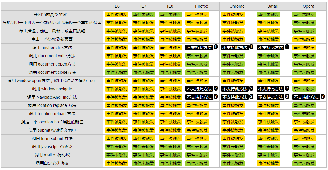- 点击一个链接到新页面、调用 window.open方法窗口名称设置值为 _self、指定一个 location.href 属性的新值、使用 submit 按键提交表单、调用 form.submit 方法在各浏览器下 onunload 事件都会被触发。
