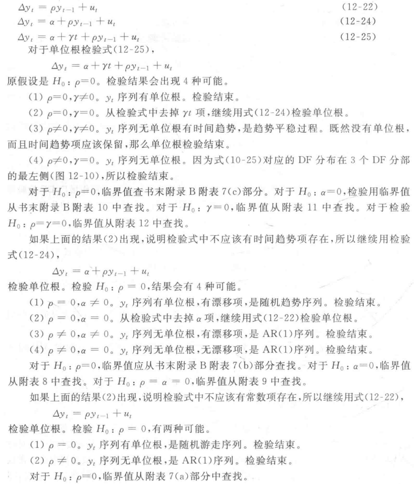 此处的12-22对应模型1,12-24对应模型2,12-25对应模型3,该书因为在模型方程两边都减去了 y_{t-1} ,所以序列如果存在单位根,则有 \rho=0 。