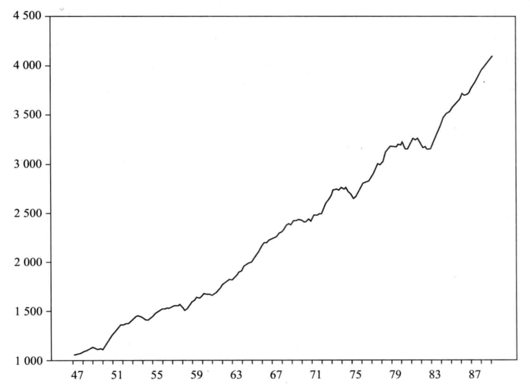 图2序列图显示序列一直是上升的,此序列要么是趋势平稳,要么是带漂移的随机游走。零假设自然是:序列是带漂移的随机游走,备择假设是:序列是趋势平稳过程。从正规步骤的步骤1开始,后面的步骤2和 1无须做,因为时序图表明这不可能是一个随机游走。