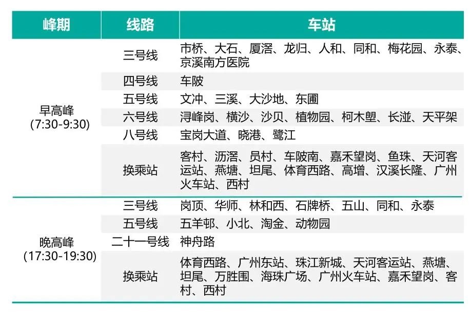 其中,一、二、三(含三北)、四、五、六、七、八、十四号线和广佛线晚高峰起峰时间将提前至约13:00,期间十四号线12:00~21:30时段的快车将转为普通车开行。