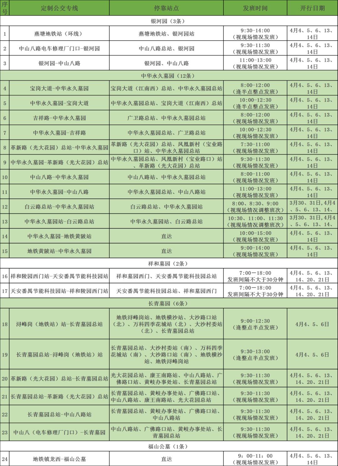 为方便市民在清明祭扫期间公交出行,市交通运输部门组织各公交企业在清明假期及随后两个周末(4月4、5、6、13、14、20、21日),开设24条往返市内各主要墓园的定制公交专线,并临时调整部分公交站点及线路停靠。
