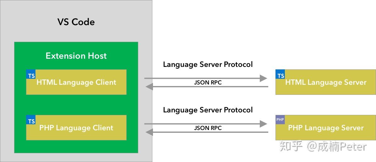 这是一张HTML语言服务协议和PHP语言服务协议的图,PHP和HTML实现了这种服务,而客户端通过JSON RPC这种远程调用,在VSCode插件进程内初始化这些语言服务。(语言服务运行在插件进程内)。