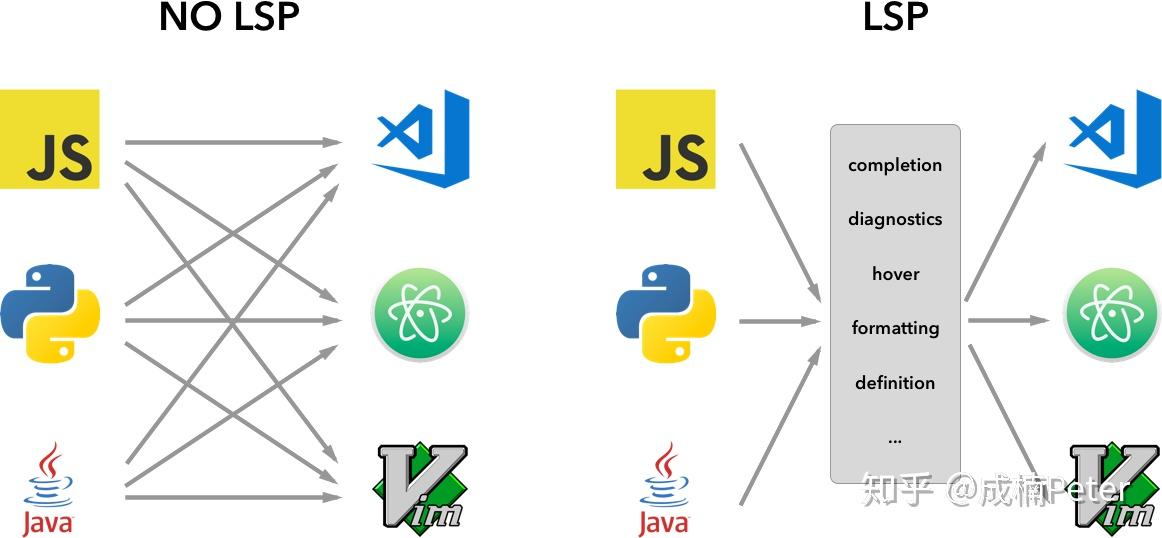 语言服务协议,编程语言需要为编辑器实现一些常用的功能,比如hover效果,代码提示(intelligence),代码诊断(diagnostics)等功能,每个编辑器都有一套自己的规则。 从图中我们可以看出,左边为编程语言,右边为编辑器。没有LSP之前,编程语言和编辑器之间是多对多的关系,这种复杂性为 n^2 。但是引入LSP之后,就变成了一对多的关系,主流编辑器都采用同一个协议规则,而编程语言只需要面向语言服务协议编写功能即可,这像不像面向接口编程。