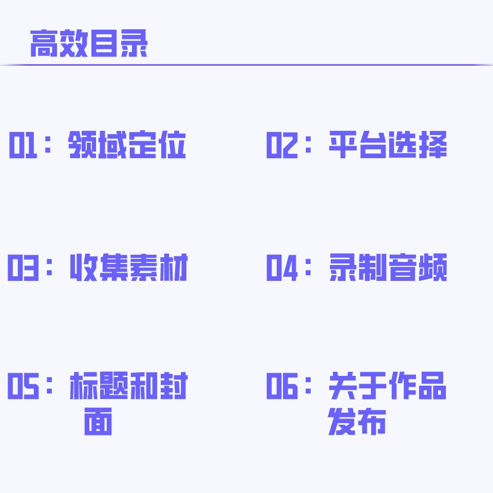 内容有点多,一共罗列了我能想到的6个方面的内容,我相信只要你认真看完,一定可以轻松了解有声书配音,为了方便查看,还是先给上一个本文的高效目录: