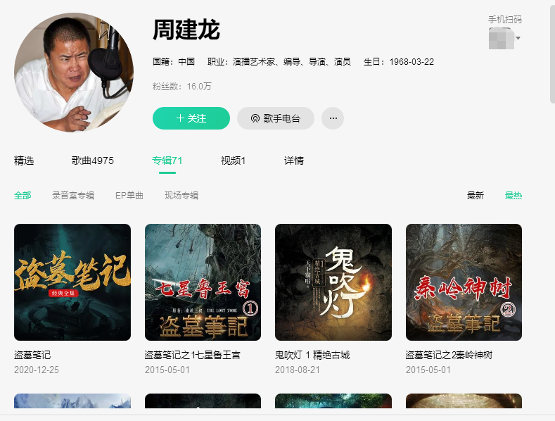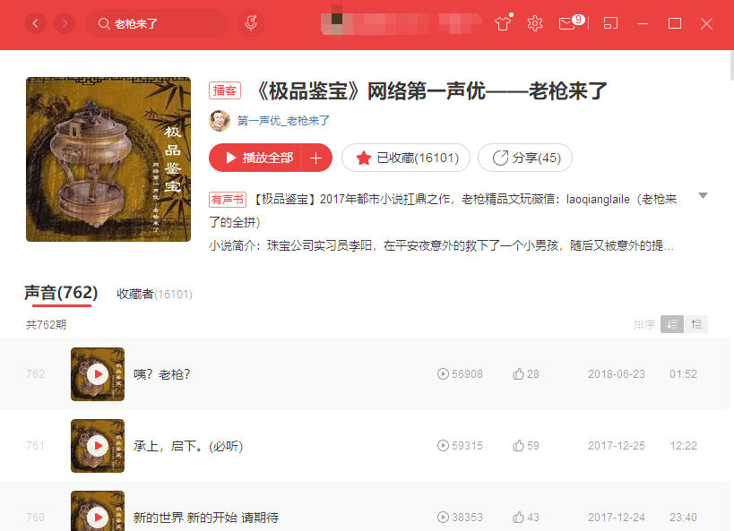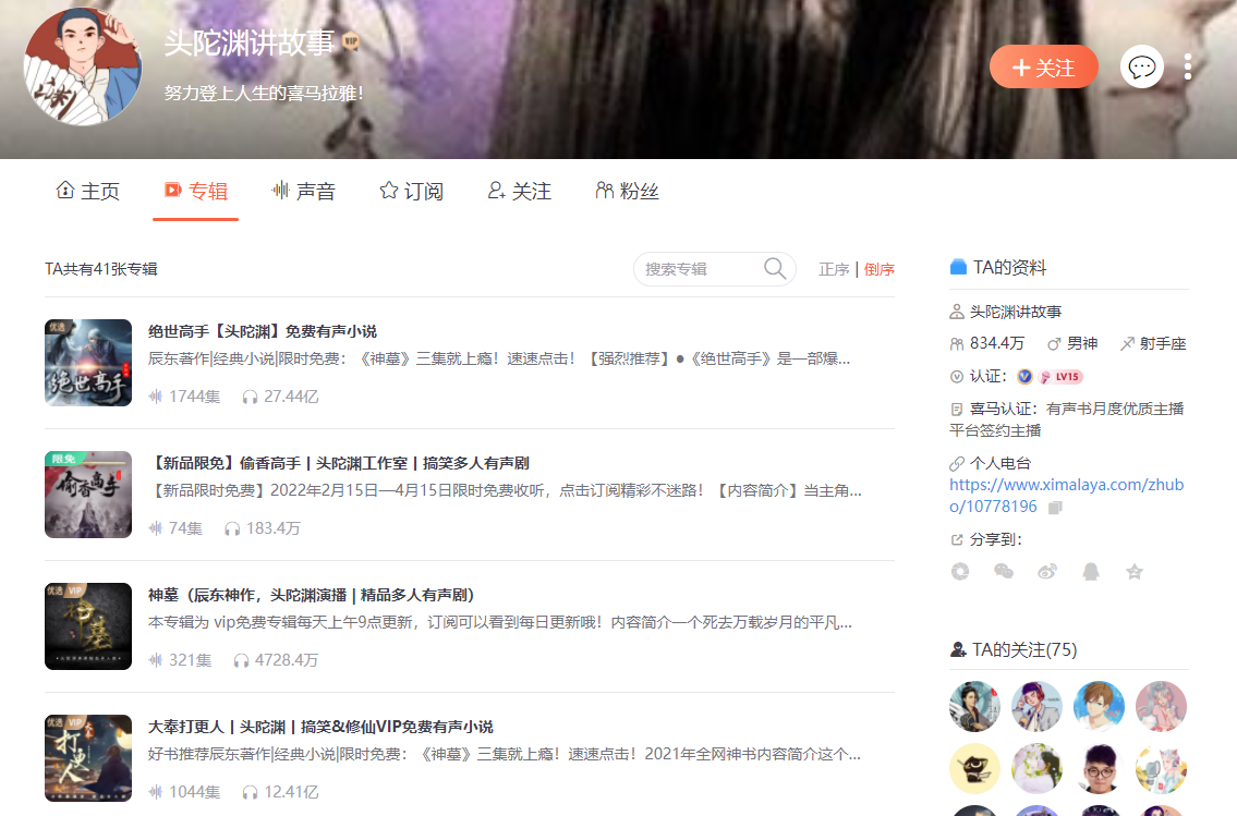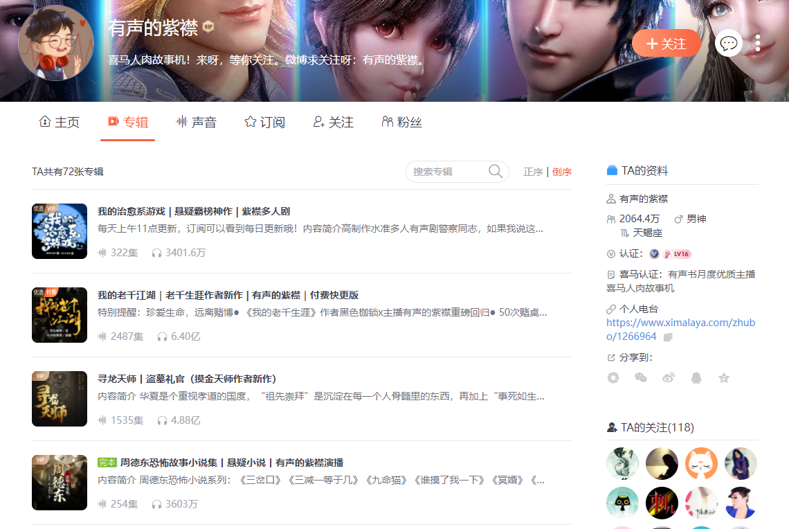 然后在这个领域里面垂直下来,一直做,就比如有声书大V有声的 紫荆 ,他的内容大部分就是悬疑惊悚类型的