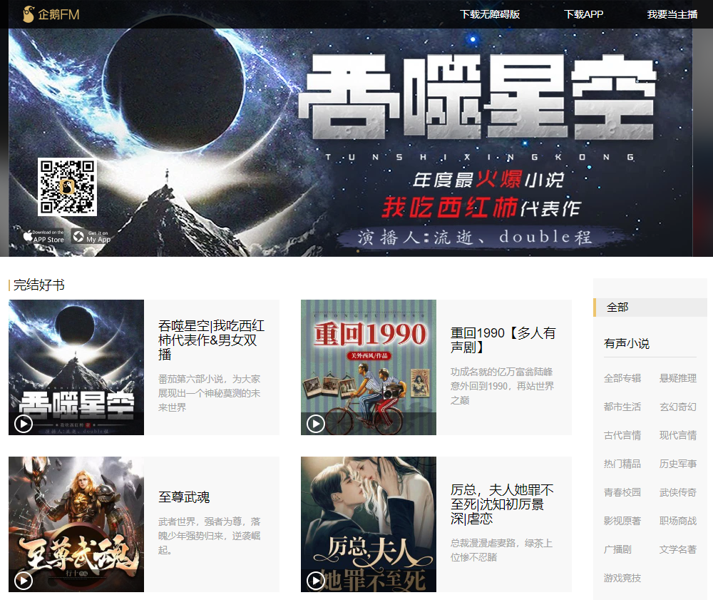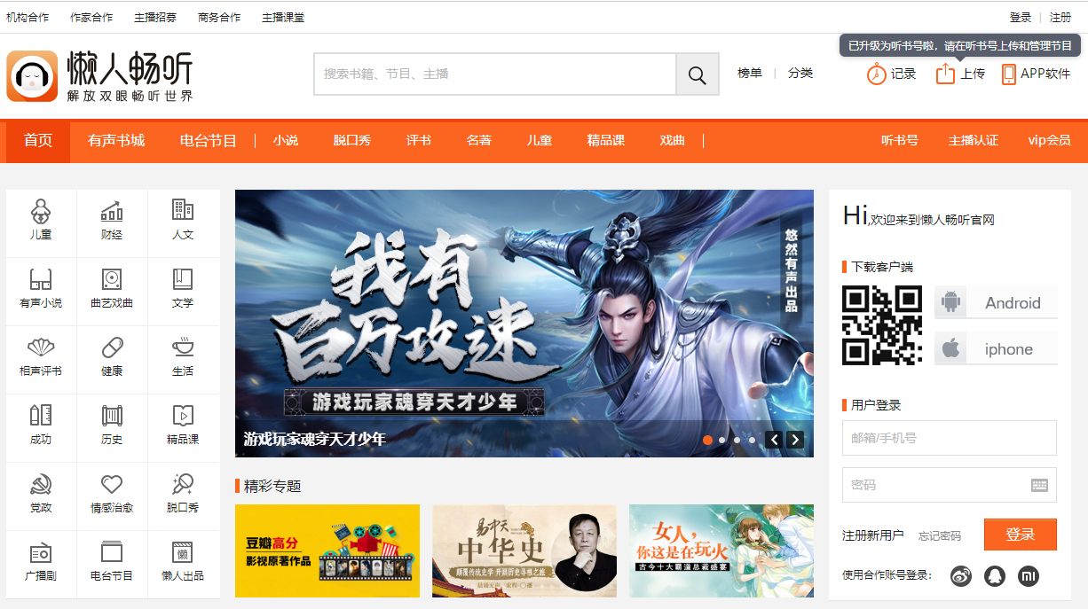 里面有非常多的免费有声书,分类导航也比较齐全,可以免费上传。