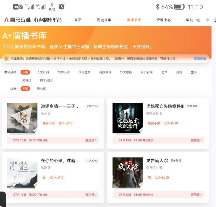 蜻蜓FM有专属的有声书接单群,注册好账号联系客服,可加入接单群。