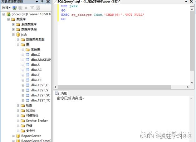 (3) 在“对象资源管理器”中选择“数据库”→“jxsk”→“可编程性”→“类型”→“用户定义数据类型”,发现数据类型Idnum已不再存在;