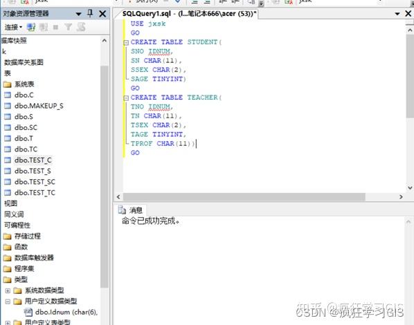 (3) 在“对象资源管理器”中选择“数据库”→“jxsk”→“表”,选择学生表STUDENT与教师表TEACHER,看到相应字段及其定义Idnum,如下图;