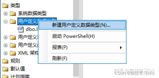 (1) 在“对象资源管理器”中选择“数据库”→“jxsk”→“可编程性”→“类型”,右击“用户定义数据类型”,在弹出的窗口中选择“新建用户定义数据类型”,如下图;