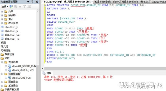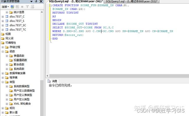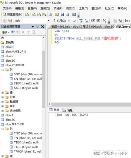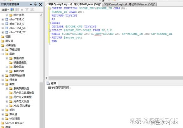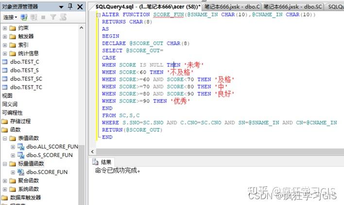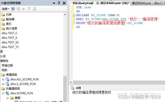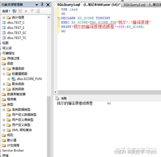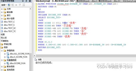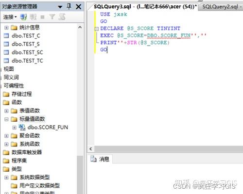 (5) 在“对象资源管理器”中选择“数据库”→“jxsk”→“可编程性”→“函数”→“标量值函数”,可看到已建立的标量函数Score_FUN;