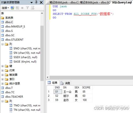 10 使用内嵌表值函数S_Score_FUN查询数据库表中信息