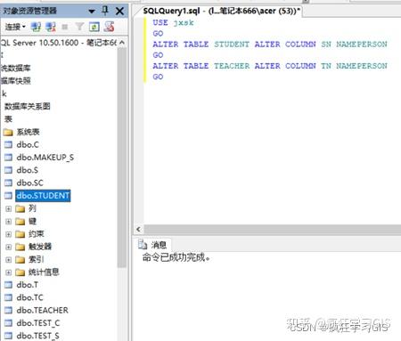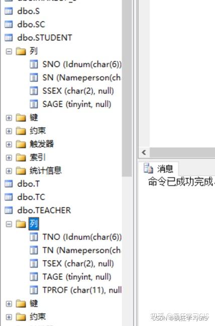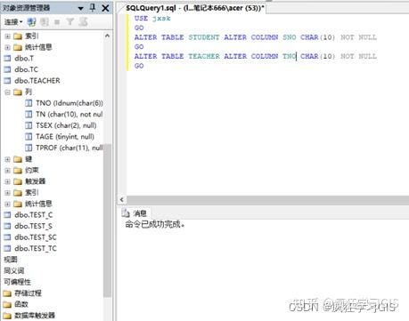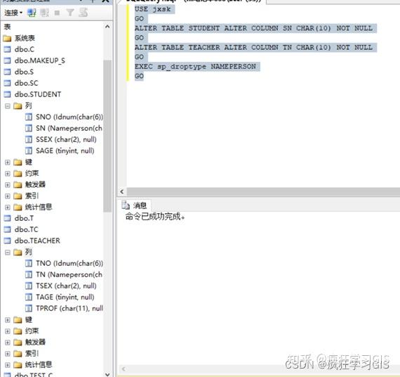 (3) 在“对象资源管理器”中选择“数据库”→“jxsk”→“表”,查看数据库表学生表STUDENT与教师表TEACHER相关列的定义已随之改变;