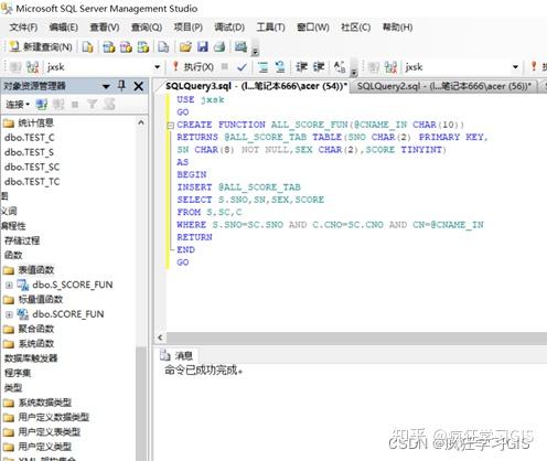 (3) 在“对象资源管理器”中选择“数据库”→“jxsk”→“可编程性”→“函数”→“表值函数”,可看到已建立的多语句函数ALL_Score_FUN;