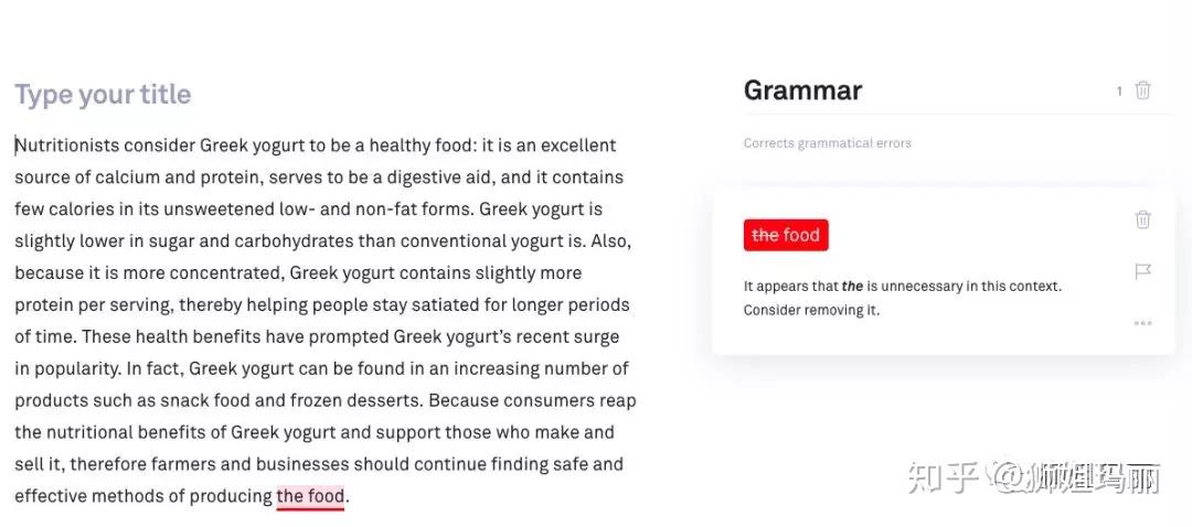 录入之后可以看到,免费的grammarly功能只给出一个建议,就是把the food前面的“the”去掉。