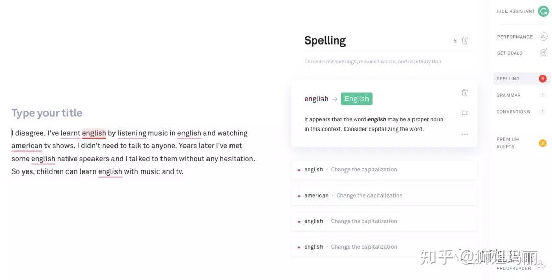 然后我们来看看grammarly会认为有几处错误。录入的时候还可以选择写作的语言属于美语,加拿大英语等,grammarly会做风格上的区分。