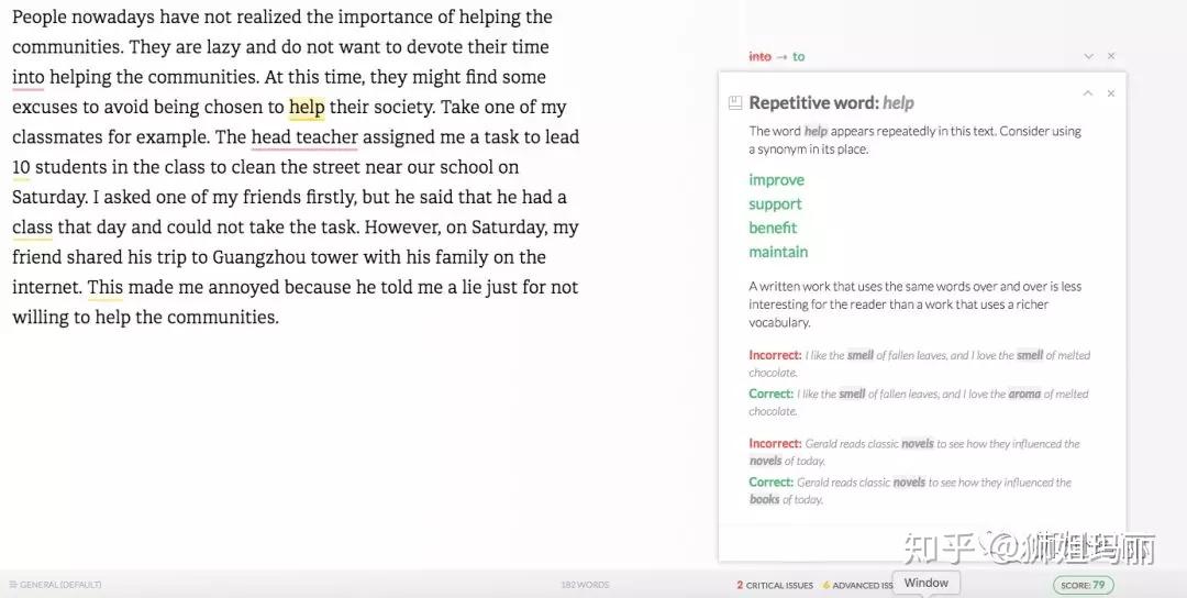 比如这篇作文,多次用了help, grammarly会给建议说这里重复用此了,并且会给出相应的替换词。 比如help可以替换为improve, support, benefit或者是maintain. 同时在下面还会给出示范和讲解。