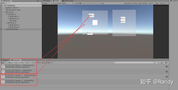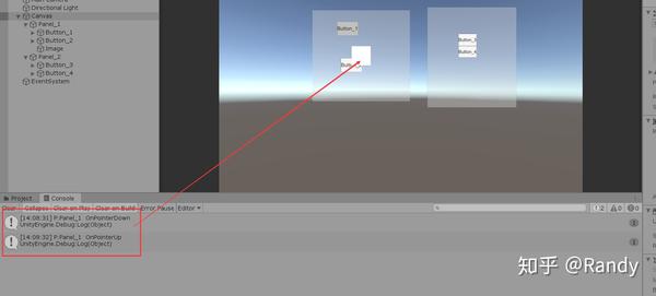 仅父对象实现 IPointerDownHandler, IPointerUpHandler 时,点击子对象中的按钮仍无法触发父对象的接口方法(可以理解为按钮组件本身就有IPointer接口)依然覆盖掉了点击向父对象的传递。但点击到子对象中Image的一类本身不具有交互性的子对象,可以正常触发父对象的接口方法