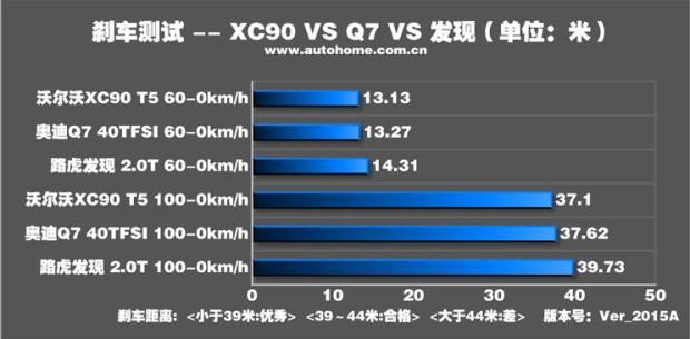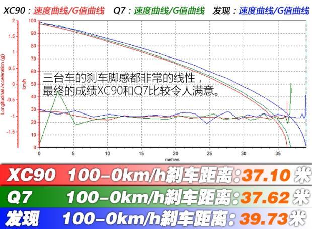 三台中大型SUV全力刹车时坐在车内都有比较明显的向前俯冲的感觉,但最终的刹车成绩XC90和Q7都表现不错,达到了我们优秀的界定。而路虎发现相比另外两台车有一定的差距,好在多次刹车后,即便体型庞大,也没有出现刹车衰减的现象,可靠性还是值得肯定的。