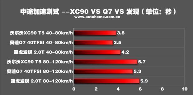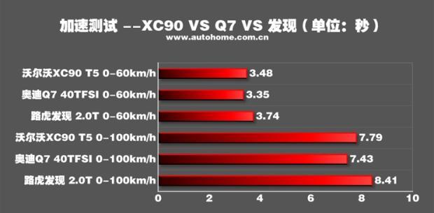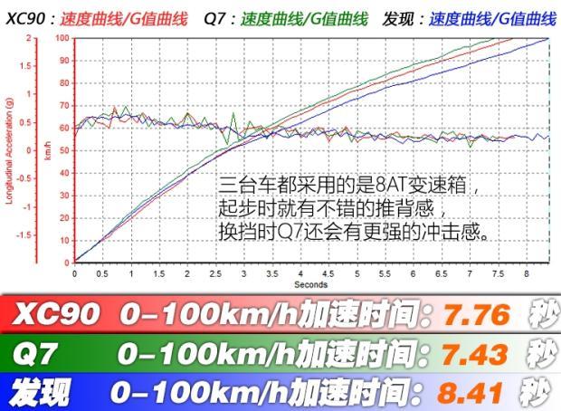 从加速表现来看奥迪Q7和沃尔沃XC90都进入了8秒大关,如此的加速成绩绝对可以让你在路上轻松呢驾驭,虽然不如3.0T有那么酣畅淋漓的加速快感,但也绝对够用了。而路虎发现会比它们稍微慢了一些,这也与它车身的尺寸和调校有关,从直观感受上来说,三台车都不会给你拖后腿,城市里巡航超车都能满足你的需要,不会有小马拉大车的感觉。