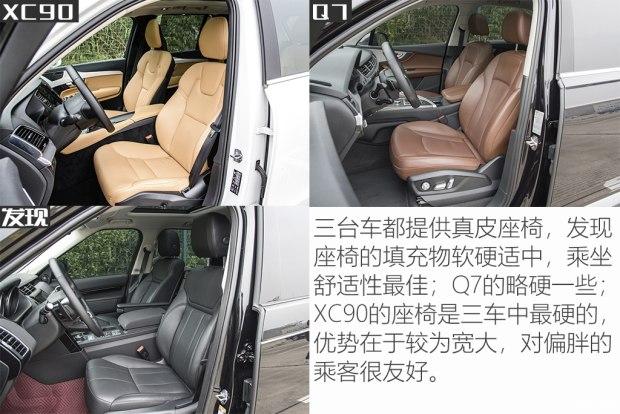 三台车都采用了真皮座椅,符合该级别车型应有的表现。而在乘坐体验方面,发现的座椅质地软硬适中,乘坐舒适性最好,但是车型的坐姿较高,上下车不如另外两台方便;Q7的皮质偏硬,会在一定程度上影响舒适性;而XC90的座椅偏硬,乘坐舒适性一般,优点是它的座椅比较宽大,对于体型偏胖的乘坐者较为友好。