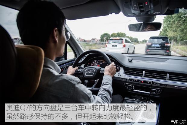 谈到驾驶品质就不得不谈手握方向盘的感觉,三台车中车身最灵活的是沃尔沃XC90,转动方向盘车头就能快速做出相应动作,这会让你觉得开起来车身没那么大,城市里穿梭会比另外两台车更容易一些,心里也有谱。奥迪Q7的转向手感最轻盈,开起来的感觉也是最轻松的,虽然车身的姿态不像XC90那么灵活,但也不会感觉到笨拙。路虎发现的转向手感比较沉,而且车头对方向盘的反馈并不是很迅速,路感相对模糊了一些,这也和它的偏向越野的定位相关。