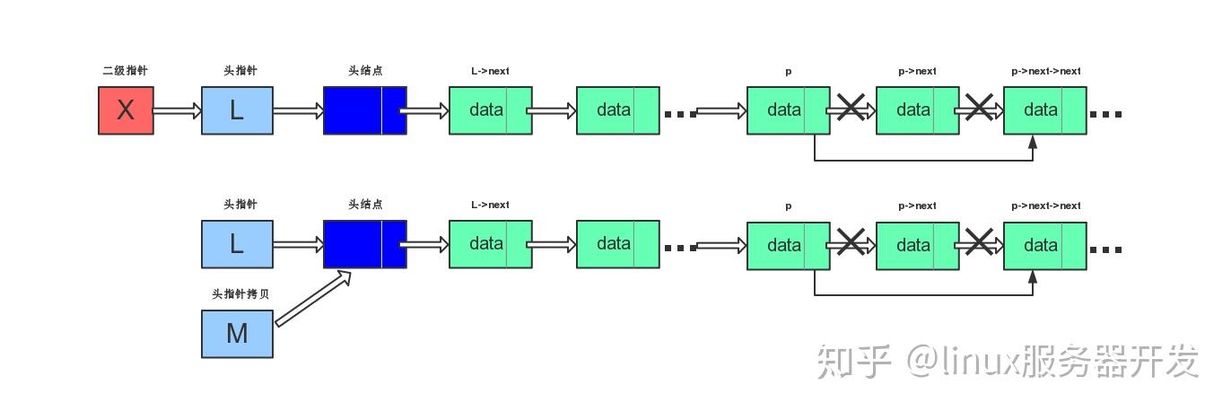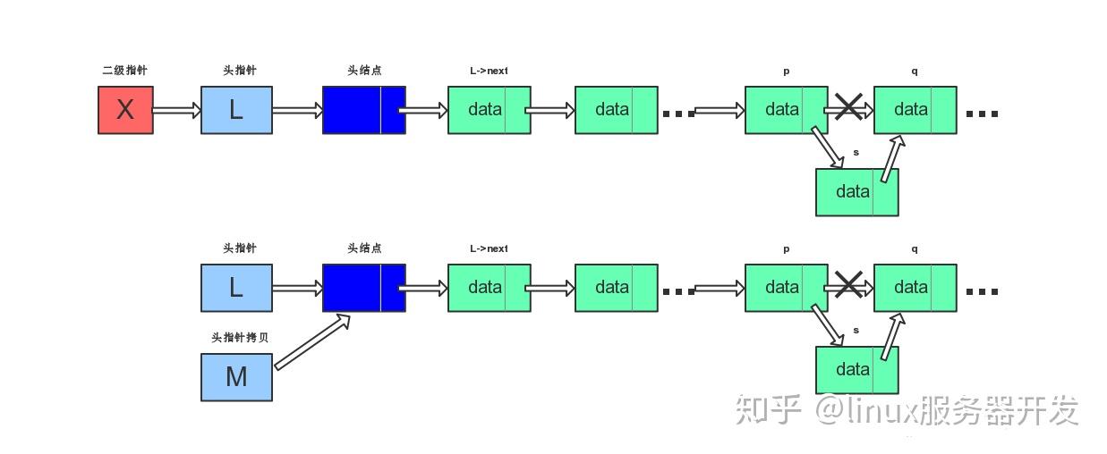传二级指针就是在从链表头指针开始对链表操作,传一级指针只不过是对头结点L生成了一个拷贝M,M的next指向的仍然是L的next,因此,后面的操作仍然是在原链表上操作。