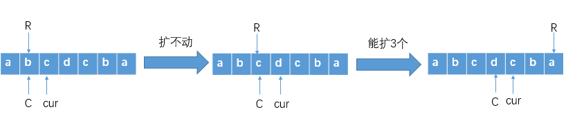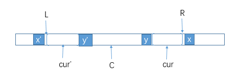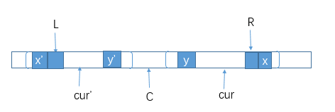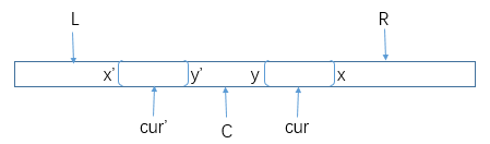 R右边一个字符x,x关于cur对称的字符y,x,y关于C对称的字符x',y'。根据C,R的定义有x!=x';由于x',y'在以cur'为中心的回文子串内且关于cur'对称,所以有x'=y',可推出x!=y';又y,y'关于C对称,且在L,R内,所以有y=y'。综上所述,有x!=y,因此cur的回文半径为R-cur+1。