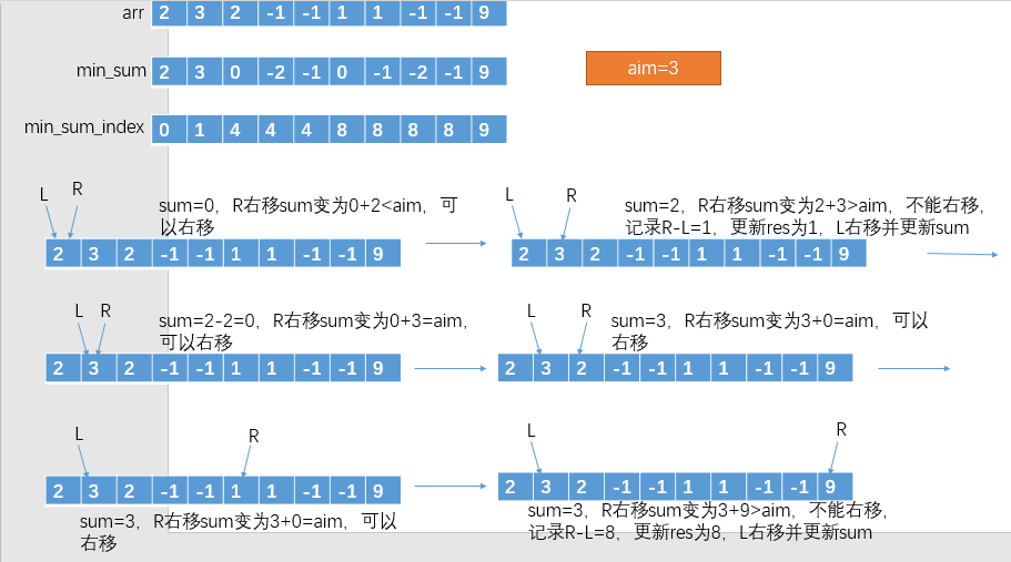 - R向右扩一次的逻辑是:如果sum + min_sum[L] <= aim,那么R就扩到min_sum_index[L] + 1的位置,并更新sum。