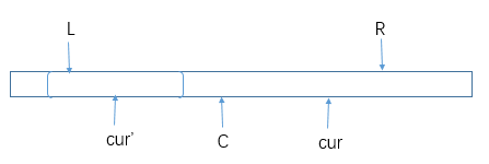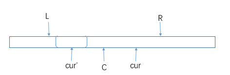 情况2是,遍历到的字符下标cur在R的左边,这时pArr[cur]的求解过程可以利用之前遍历的字符回文半径信息来加速。分别做cur、R关于C的对称点cur'和L: