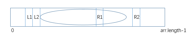 假设,椭圆区域就是和为aim的最长子数组,如果L来到了椭圆区域的左边界L2,那么R的位置有两种情况:在椭圆区域内比如R1,在椭圆区域外比如R2。如果是前者,由于窗口L2~R1是肯定小于aim的(元素都是正数),因此在R从R1右移到椭圆区域右边界过程中,L是始终在L2上的,显然不会错过正确答案;如果是后者,窗口L2~R2的sum明显超过了aim,因此这种情况是不可能存在的。而L在L2左边的位置上,比如L1时,R更不可能越过椭圆区域来到了R2,因为窗口是始终保持sum<=aim的。