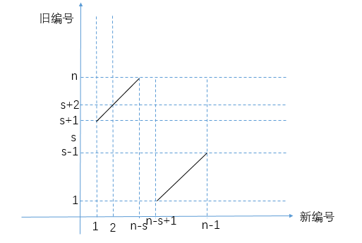如果链表结点数为n,报数到m杀人,那么结点的新旧编号对应关系如下(其中s为报数为m的结点编号):