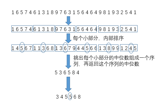 BFPRT算法首先将数组按5个元素一组划分成N/5个小部分(最后不足5个元素自成一个部分),再这些小部分的内部进行排序,然后将每个小部分的中位数取出来再排序得到中位数: