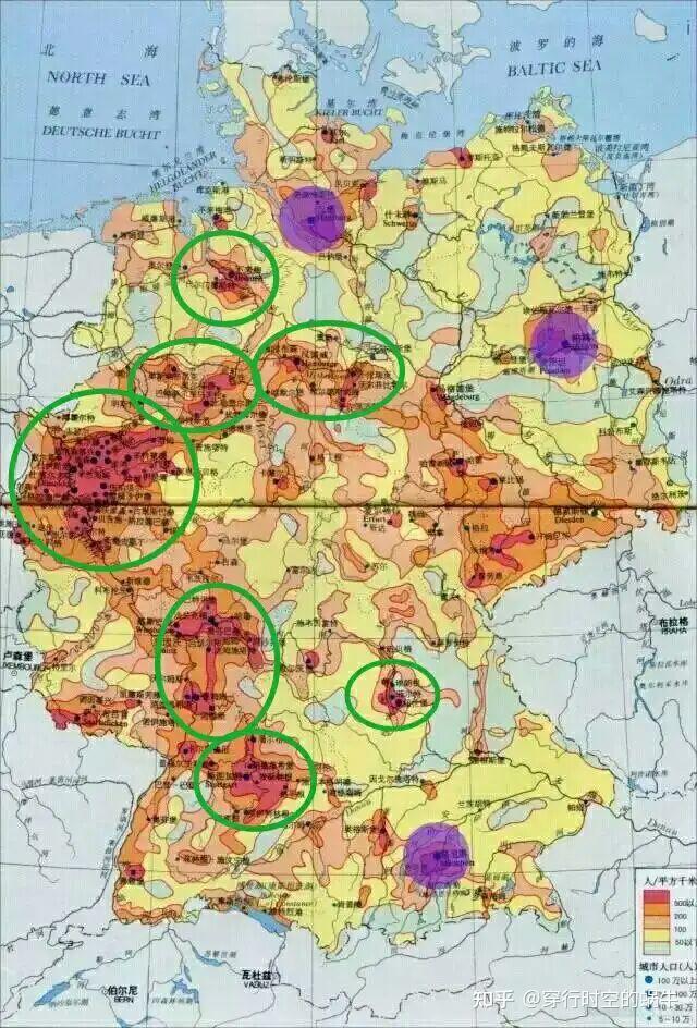 上图是德国的人口分布图,可以看到图中我用绿色圆圈圈出来的地区,人口都非常密集。这些地区就是德国的主要城市群所在。在这些城市群中,有很多城市实际上是连在一起的,他们共同构成了一个自然城市。其中最明显的,就是人口1100万人的莱茵-鲁尔城市群。在这个城市群中,以杜伊斯堡、多特蒙德为代表的鲁尔都会区,其内部各城市实际上是连成一体的,它其实就是一个自然城市。杜塞尔多夫及其周边城市组成的都会区,实际上也同样是一个自然城市。