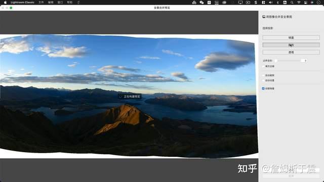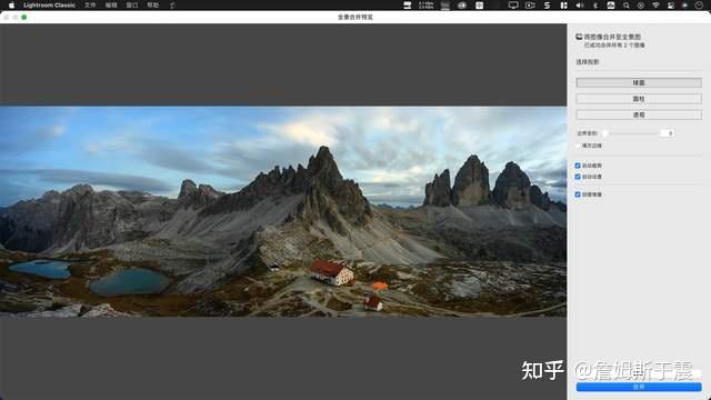 选择需要合并的照片,不用在意顺序,软件足够聪明会自行判定,右键弹出菜单,或者通过主菜单,转到照片> 照片合并 > 全景图 Lightroom 开始全景预览。
