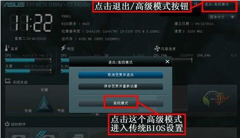 2、进入UEFI BIOS后,点击右上角的“退出高级模式”,并确认,如下图: